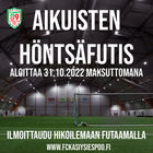 Toiminta alkaa ma 31.10.2022. Hikoilut kerran viikossa maanantaisin kello 21.00-22.00. Höntsäfutis on kerran viikossa tapahtuvaa jalkapallon pelaamista leikkimielisesti huippuolosuhteissa. Tavoitteena meillä on hiki, hyvä fiilis ja hauskaa yhdessäoloa "kuningas jalkapallon" parissa..Höntsäfutaajat eivät pelaa mitään virallista sarjaa, vaan nauttivat lajista ja pääsevät edullisesti kokeilemaan harrastusta saman henkisten ihmisten ja jalkapallon parissa.
