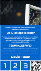-25% jalkapalloilusta. Tarjous on voimassa kaikissa Stadium-myymälöissä sekä ositteessa stadium.fi. Hyödynnä tarjous verkkokaupassa käyttämällä alekoodia tai myymälässä QR-koodia.