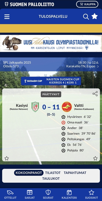 Naisten Suomen Cupin 4. kierroksen peli Kasiysi - Valtti pelattiin Karakalliossa 12.6.25 Kasiysin TB-joukkue kohtasi Naisten Suomen Cupin 4. kierroksen ottelussa Naisten Kakkosta pelaavan Puotilan Valtin naiset. Valitettavasti TB:n Cup-juna pysähtyi kotikentälle selvin numeroin 0-11. Onnittelut joukkueelle hienosta Cup-taipaleesta ja tsemppiä Valtille seuraavalle kierrokselle! |