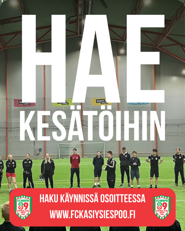 FC Kasiysin strategian mukaisesti seura haluaa olla vaikuttava tekijä koko omalla toiminta-alueellaan kehittämällä ihmisten hyvinvointia, osaamista ja rakkautta jalkapalloon. Kesätöiden tarjoaminen paikallisille nuorille on juuri sitä! Haussa etusijalla ovat vuosina 2007–2011 syntyneet nuoret, jotka voivat hakea Espoon kaupungin kesäseteliä. Nuoren tulee itse hakea kesäseteliä kaupungilta sitten, kun työpaikka on varmistunut. Tiedot vuoden 2026 kesäseteleistä päivittyvät Espoon kaupungin kotisivuille myöhemmin: https://www.espoo.fi/fi/kesaseteli. Tutustuthan huolellisesti ohjeisiin! Kasiysi järjestää kesäleirejä kesäkuun kahdella ensimmäisellä viikolla ja elokuun alussa arkisin kello 9–15. Jalkapallokoulu järjestetään tiistai- ja keskiviikko-iltaisin kello 17–19 välisenä aikana huhtikuun lopulta syyskuulle. Kesäsetelillä haettavat työt ovat osa-aikaisia. Merkitse KESÄTYÖHAKEMUS aiheeksi sähköpostiviestiisi. Kerrothan hakemuksessasi seuraavat asiat itsestäsi: Mahdolliset haastattelut sijoittuvat ajalle 16.2.-15.3.2026. |